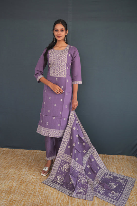 Lavender Handwoven Khadi Silk Suit Set for Women | Embroidered Kurta with Pants & Dupatta | Elegant Festive Ethnic Wear